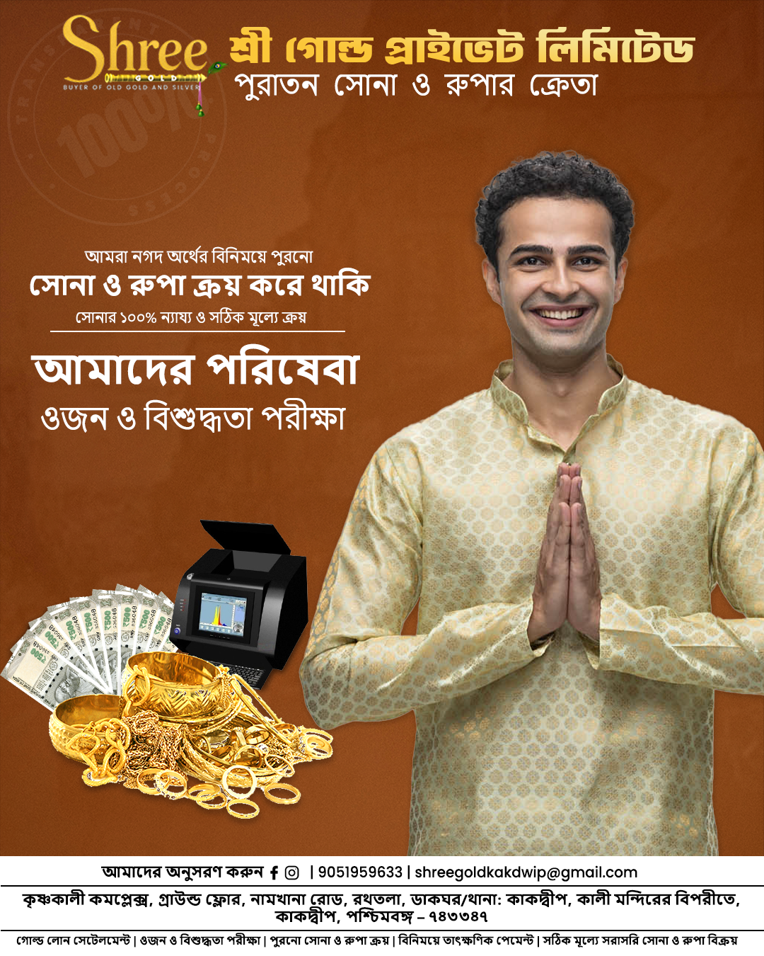 Welcome to Shree Gold Pvt. Ltd., one of the most trusted and reputed old gold buyers in Kolkata. Established in 2000, we have been serving our valued customers for over two decades with honesty, transparency, and professionalism. At Shree Gold Pvt. Ltd., we specialize in buying old gold jewellery, coins, and ornaments, offering fair valuations and instant cash payments. Our commitment to integrity and customer satisfaction has helped us become a leading name in the gold buying industry across West Bengal. With a team of expert gold valuators and the use of advanced purity testing machines, we ensure that every transaction is conducted accurately, safely, and transparently. Whether you want to sell your old jewellery or exchange unused gold items, we promise a smooth, secure, and rewarding experience. We take pride in being known as a brand built on trust and customer confidence, where every client is treated with respect and fairness. At Shree Gold Pvt. Ltd., your satisfaction is our top priority.