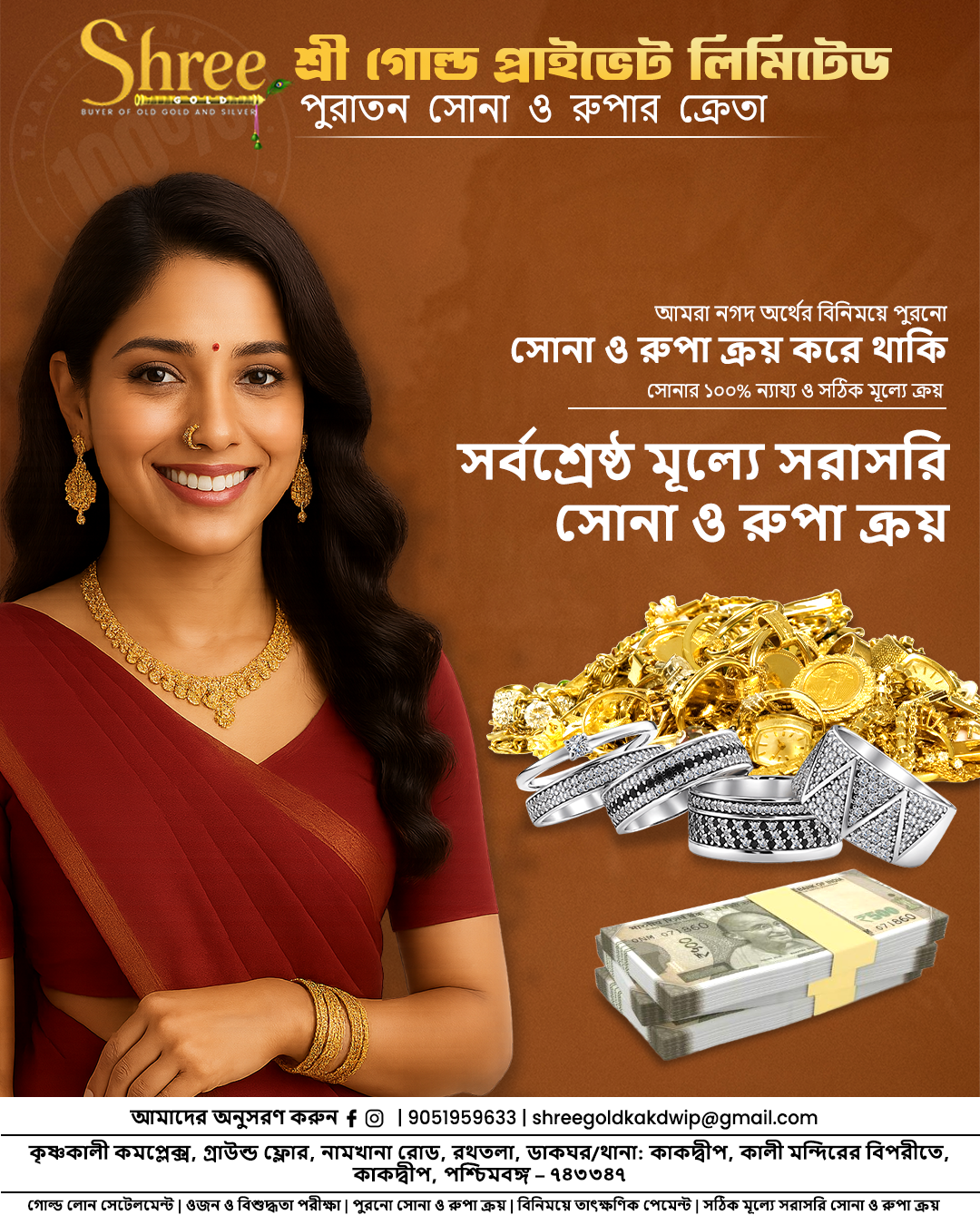 For over two decades, Shree Gold Pvt. Ltd. has been Kolkata’s most trusted destination for instant cash against gold and silver. With our experience and credibility, we ensure a safe, transparent, and quick process that helps you get the best market value for your old jewellery and coins — instantly!